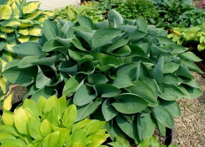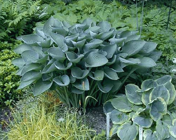 Ez a növény impozáns, felálló habitusú, a kert árnyékos részeinek fókuszpontja lehet. Nagy termetű, bokros növekedésű, sűrű tőlevélrózsát képező növény, amely körülbelül 60 cm magasra és szélesre nőhet, nagy, szív vagy ovális alakú, sötét, kékeszöld, viaszos felületű levelekkel.