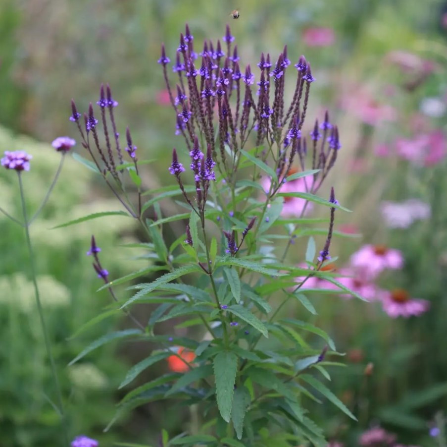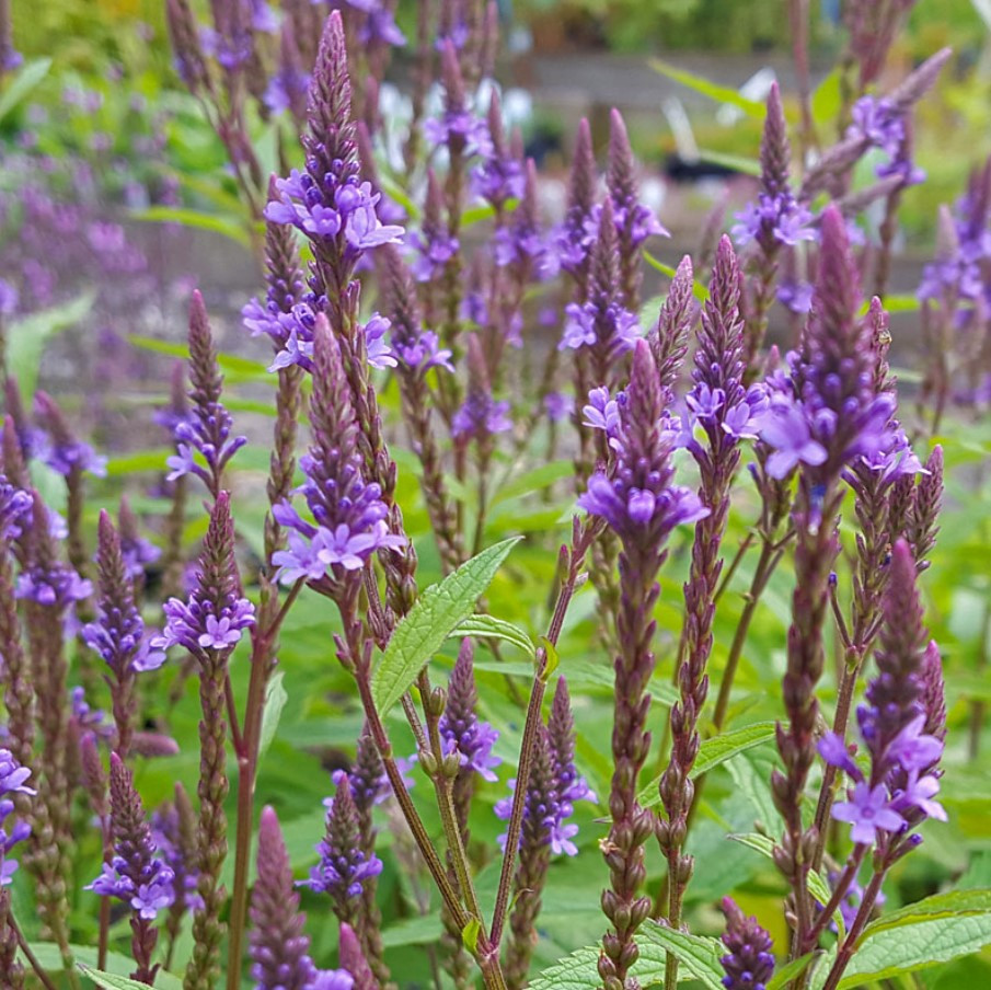A Blue Spires, a lándzsalevelű verbéna kék változata, amely sokágú, gyertyatartó-szerű virágfejekkel rendelkezik. A virágok fokozatosan nyílnak felfelé a száron. A nyár közepétől késő őszig díszítenek, különösen akkor, ha az elnyílt virágokat visszavágjuk, ami másodvirágzást eredményezhet.