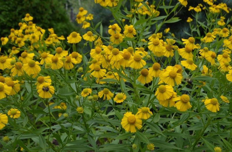 Bokros növekedésű, 70-120 cm magas lágyszárú évelő. Aranysárga virágai hosszan nyílnak, akár júliustól októberig. Fészekvirágzata van, melynek közepe kúposan kiemelkedik. A virágszirmok a végeik felé szélesednek, fogazott szélűek és lefelé állnak. Napos fekvést, jó tápanyagellátottságú talajt és párás helyet kedvel. A szárazságot nem jól tűri, nagy melegben öntözést igényel. Csoprtba vagy szoliterként ültetve is mutatós.