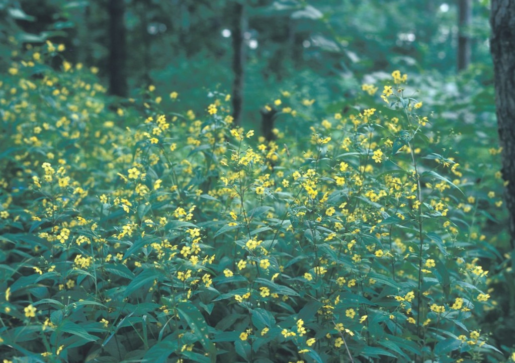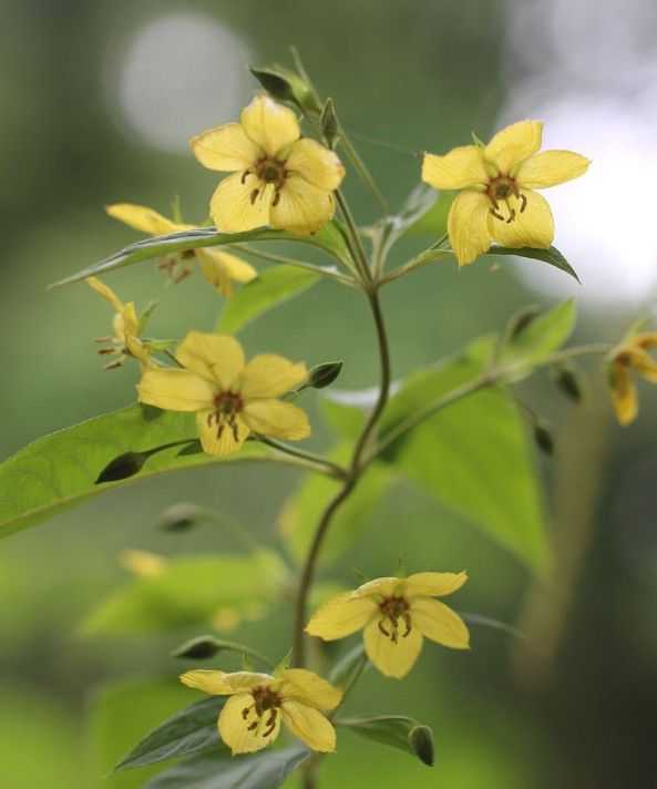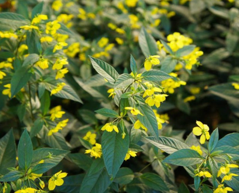 Nyár közepétől késő nyárig (júliustól augusztusig) virágzik, amikor csésze alakú, élénk sárga vagy aranysárga virágai a hajtások felső részén, a levelek hónaljában, laza fürtökben nyílnak, enyhén bókoló megjelenéssel. Erőteljesen terjedő rizómái miatt invazívvá válhat, ezért érdemes a terjedését kordában tartani, vagy gyökérkorláttal ültetni.