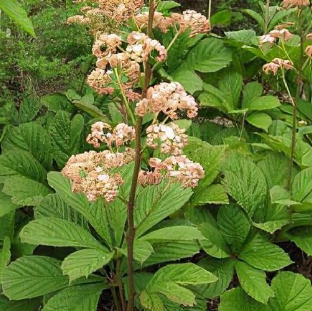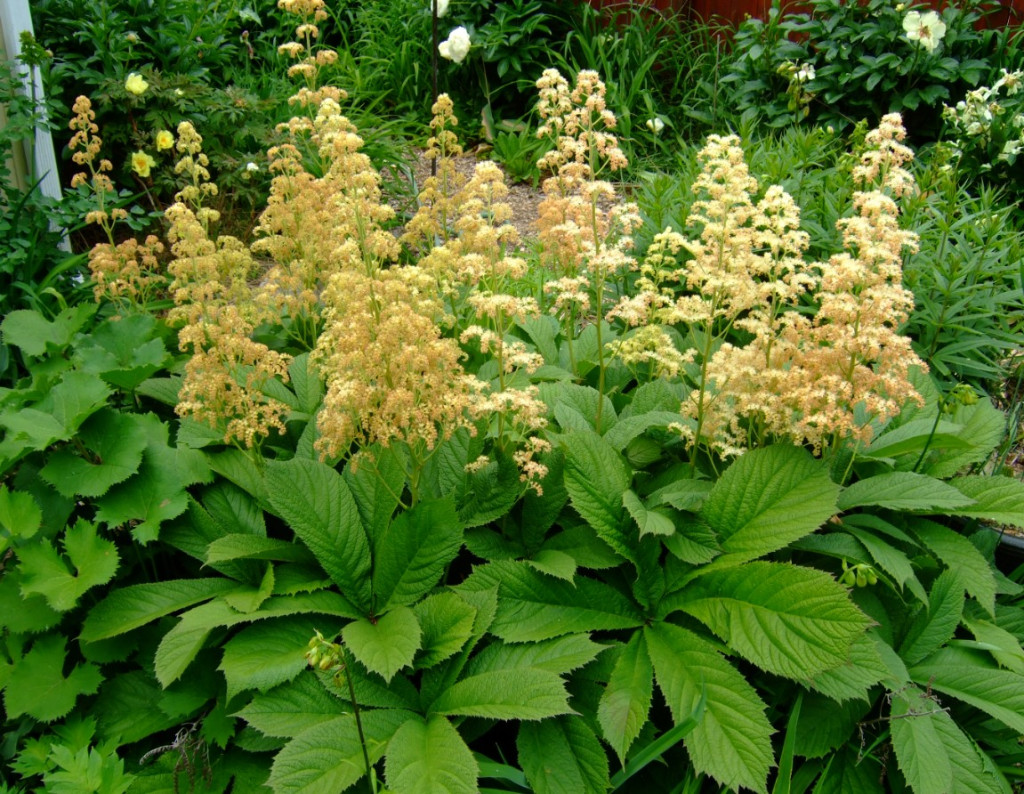 A virágzás a nyár közepén (június-júliusban) történik, amikor a masszív, gyakran vöröses árnyalatú szárakon laza, elágazó, tollas virágbugák jelennek meg, telis-tele apró, csillag alakú, krémes fehér, rózsaszín vagy mélyebb piros árnyalatú virágokkal. A virágzat hosszan díszít, és még elnyílás után is dekoratív struktúrát képez, amely télen is a növényen maradhat.
