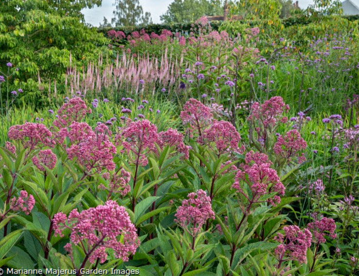 Magas termetű, terebélyes évelő. Erős egyenes szárain hozza méretes sátorozó fürtben nyíló fészekvirágzatát. Levelei sötétzöldek, hosszúkás, lándzsa formájúak. Gyors növekedésű, mérete: 1,5-2 méter. Magas termete ellenére sem igényel támasztékot. Nyár közepétől őszig virágzik, vonza a pillangókat, méheket. Virága enyhén vanília illatú. Napos, nyílt terepen, átlagos kerti talajban fejlődik jól. Viszonylag szárazságtűrő. Nyári forróságban öntözzük rendszeresen, mert levelei megégnek. Februárban vágjuk vissza az elszáradt szárakat.